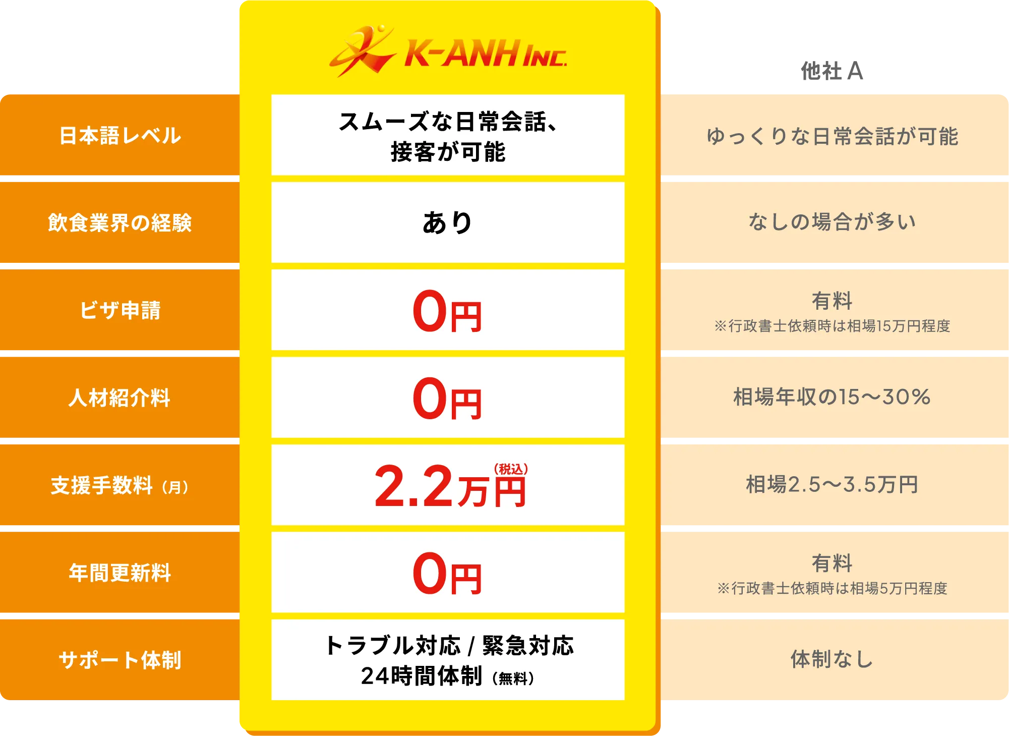 はい、紹介料0円/ビザ申請費0円/年間更新料0円です。採用後に発生するのは【月額の支援費 2.2万円(税込/人)】のみ。求人掲載・候補者マッチング・面談調整・入社前オリエン・行政手続き同席・入社後フォロー(生活・労務・トラブル一次対応)まで、すべて含まれているのでご安心ください。